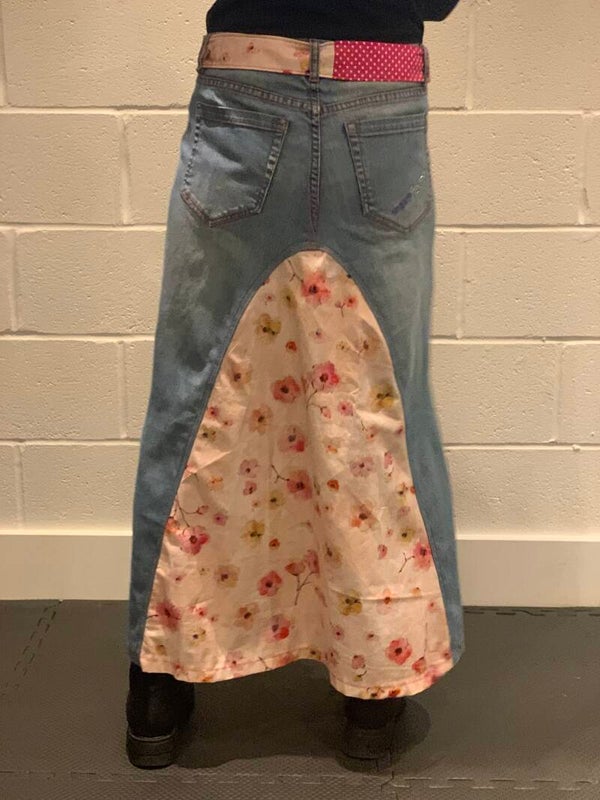 One-of-a-kind upcycled denim maxi skirt. It is crafted from repurposed blue denim with large, eye-catching central panels of light pink floral fabric. Enhaced with a functional belt in two vibrant prints, and decorative hanging ribbons.