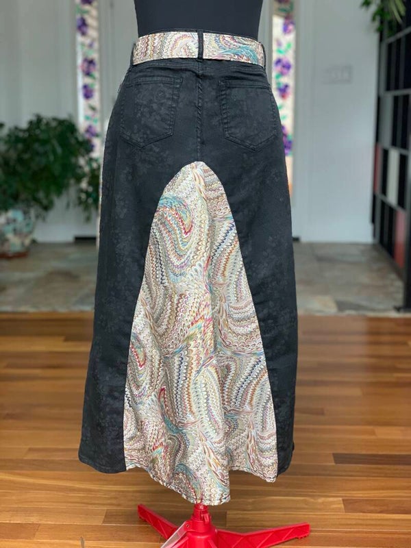 Upcycled black denim midi skirt with multi-color paisley print godets. It includes a matching fabric belt, enhanced with colorful ribbons.