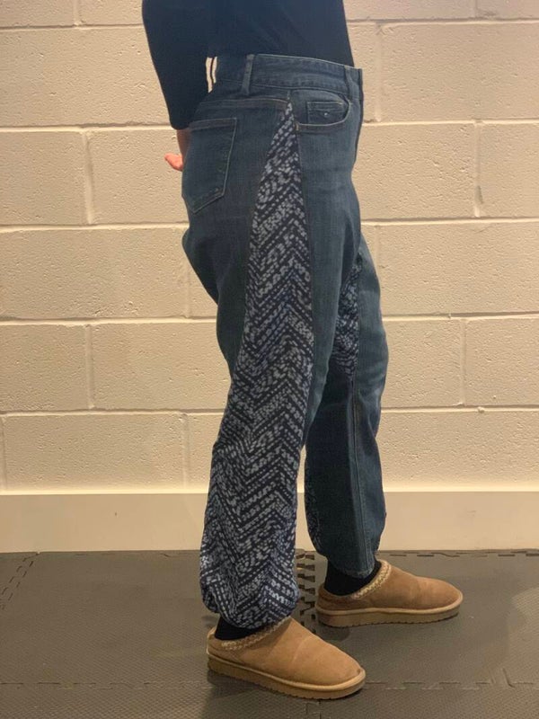 Unique upcycled denim harem jeans with navy & white "snake print" side inserts. This unique pair features a custom design with fabric panels down the outer leg seams, and dropped crotch, creating a trendy, harem silhouette that tapers towards the ankle.