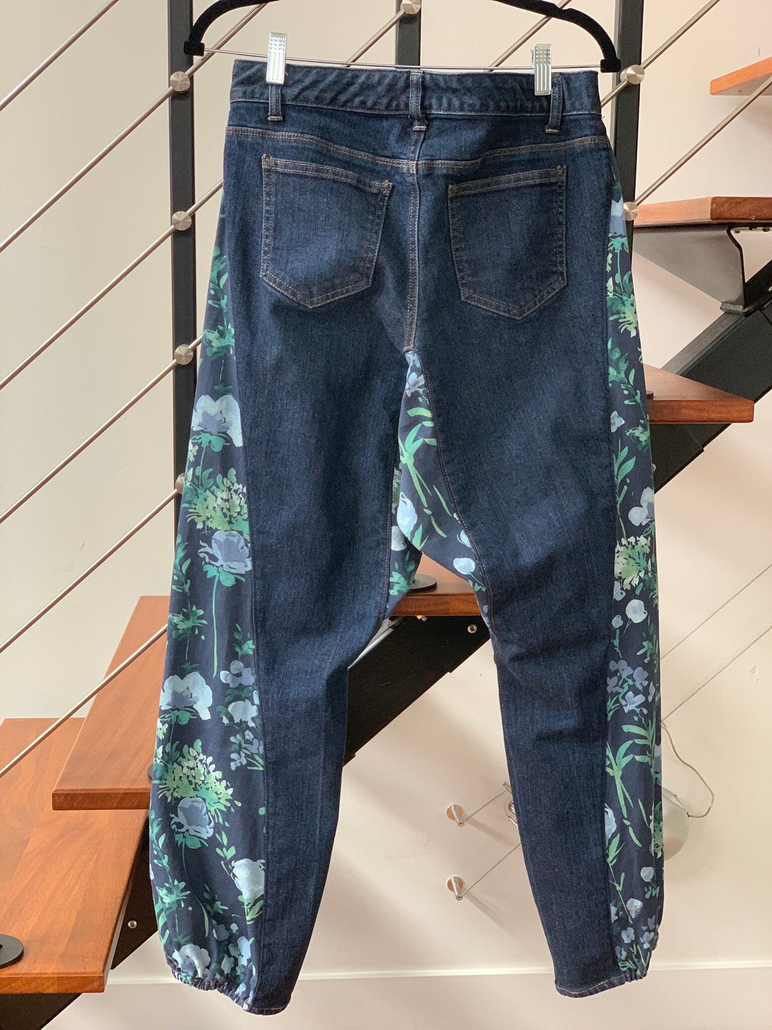 Unique upcycled denim harem jeans with navy blue and green botanical panels. This unique pair features a custom design with fabric panels down the outer leg seams, and dropped crotch, creating a trendy, harem silhouette that tapers towards the ankle.