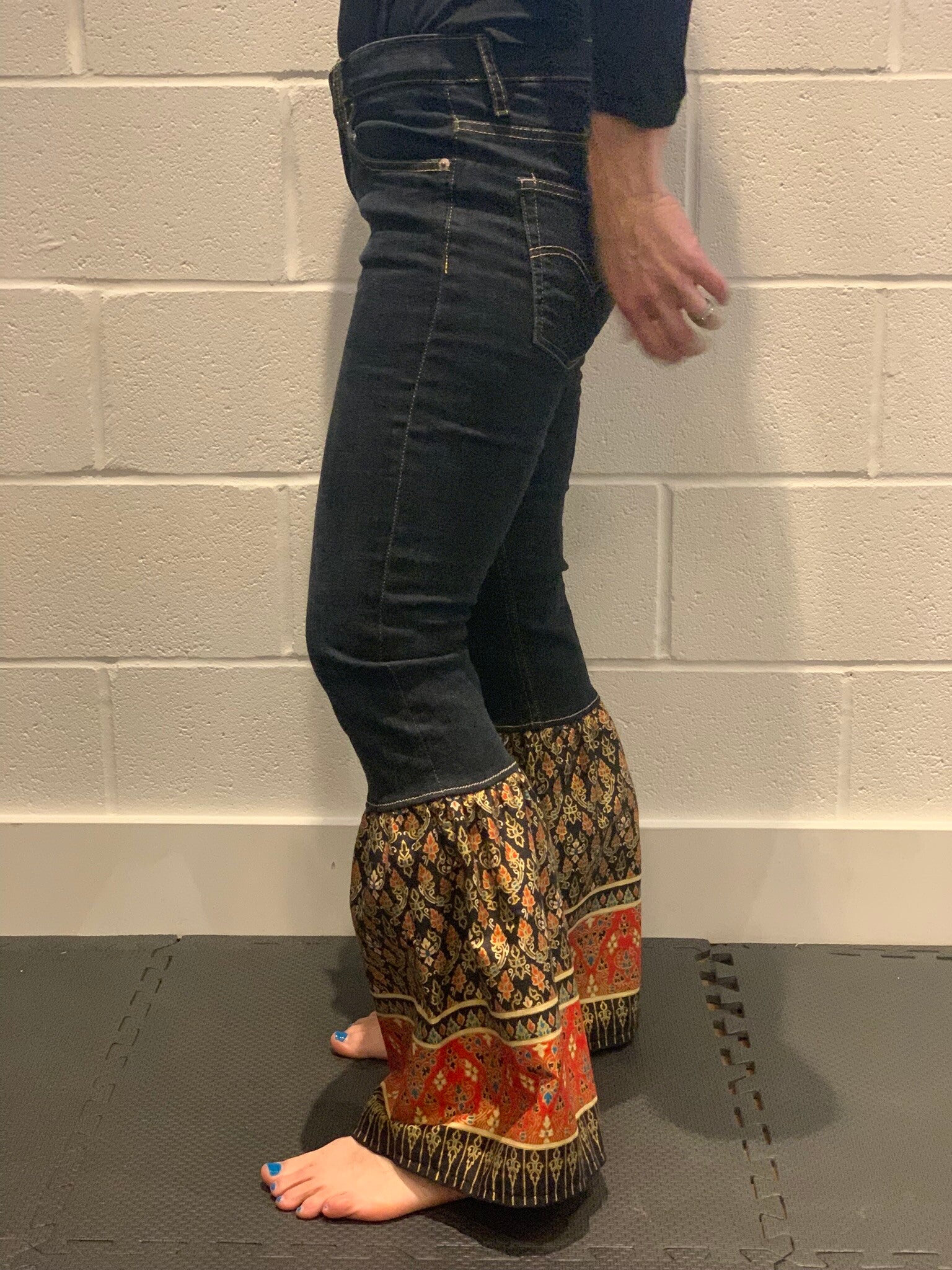 These are a classic dark wash denim base that has been expertly repurposed and customized with wide bell-bottom flares made from Thai brocade pattern fabric. The vibrant red, gold, orange, and black pattern creates an eye-catching, festive look.
