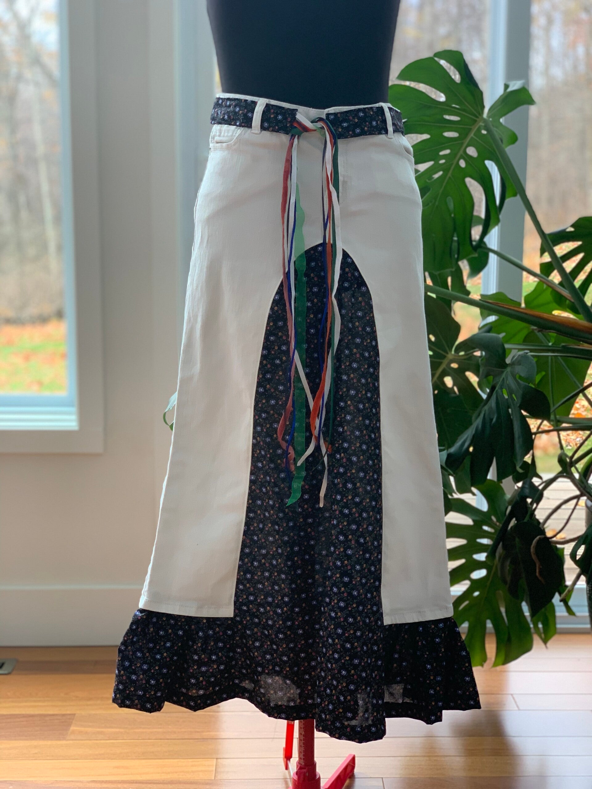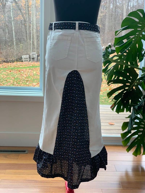 One-of-a-kind upcycled white denim midi skirt with floral ruffles on the sides, and back and front panels. It includes a matching fabric belt, enhanced with colorful ribbons.