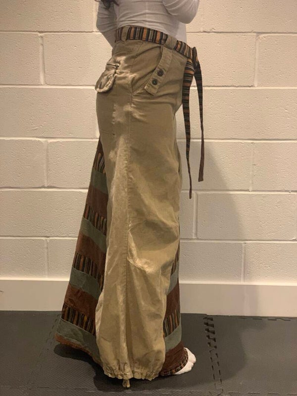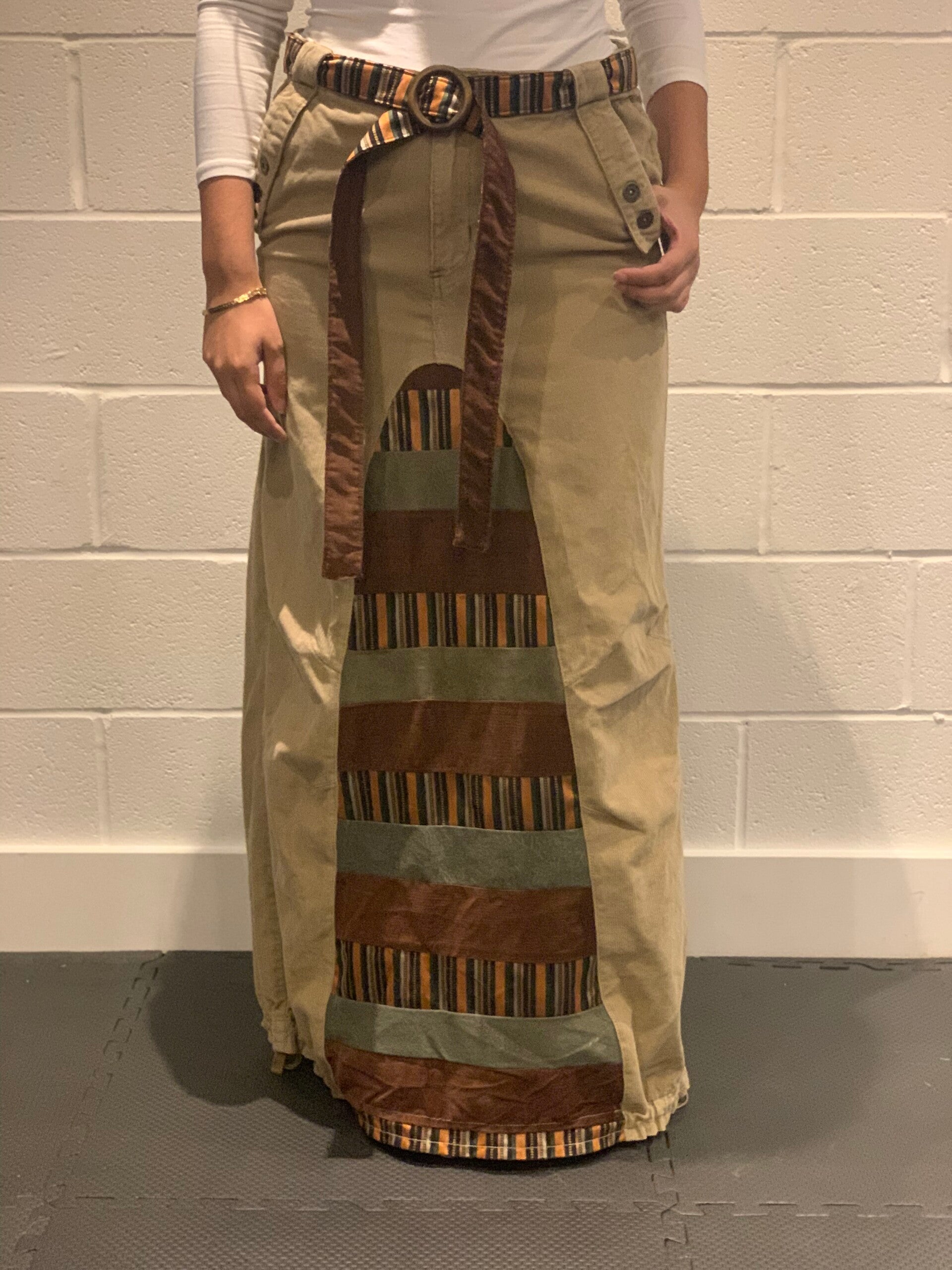 Unique upcycled corduroy maxi skirt with striped inset: crafted from high-quality second-hand corduroy pants. A distinctive central panel features green, brown, and gold stripes, adding visual interests. It includes a matching patterned fabric D-ring belt for a cohesive look.