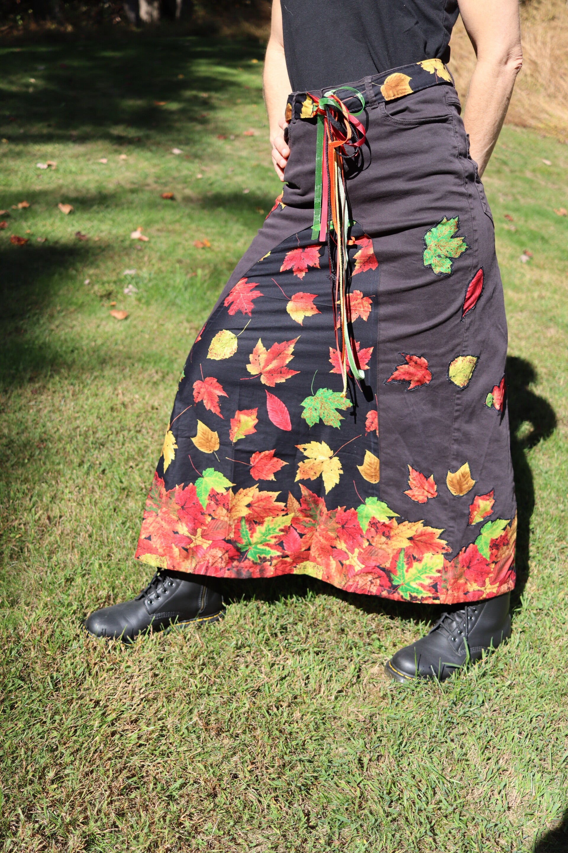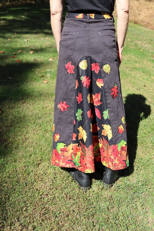 One-of-a-kind bohemian upcycled black denim maxi skirt with autumn leaf appliqués: crafted from repurposed black denim with large, eye-catching central panels of autumn leaf fabric, decorated with autumn leaf appliqués. It includes a functional belt in matching print fabric, and decorative hanging ribbons.