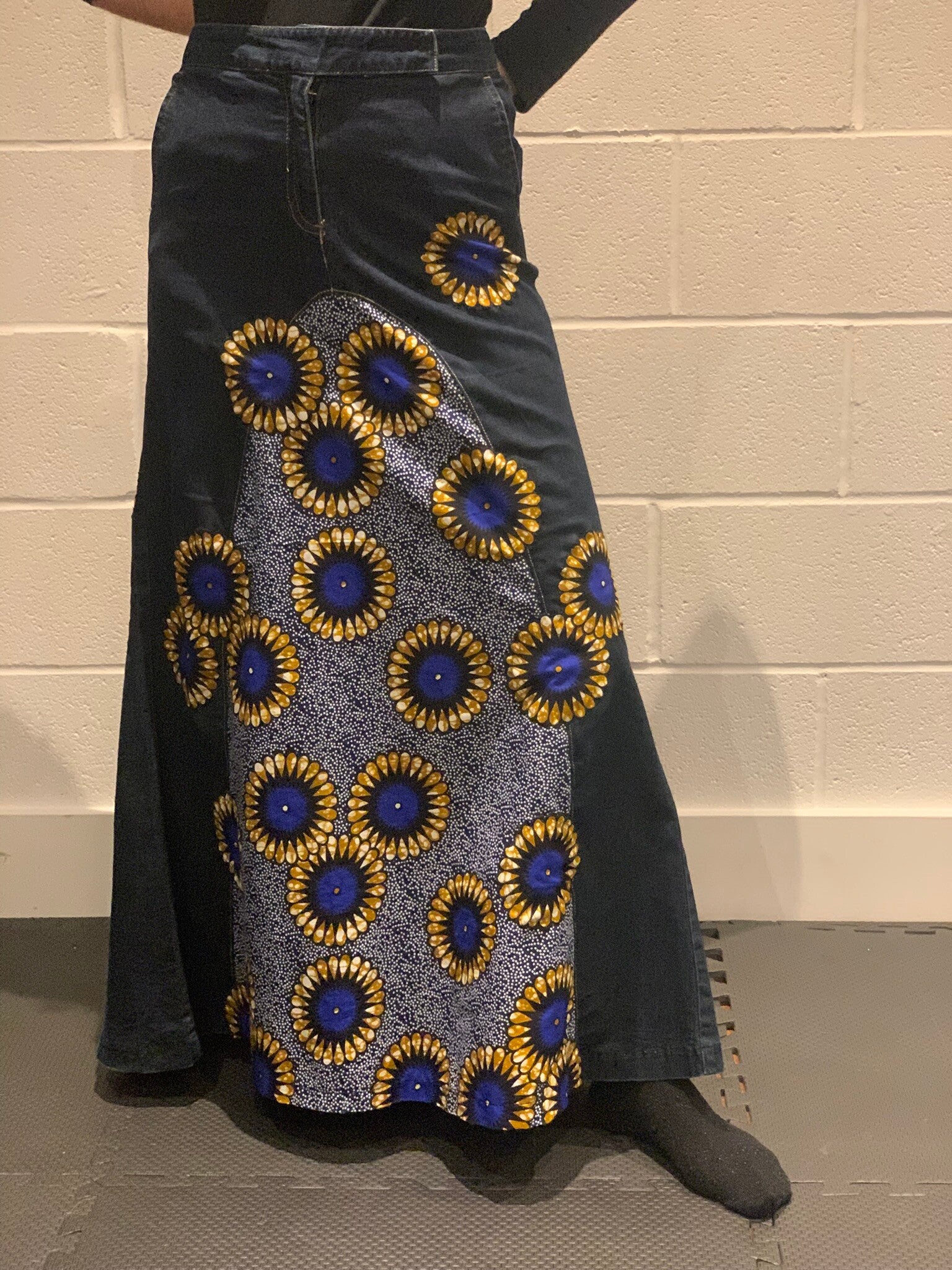 One-of-a-kind bohemian upcycled dark denim maxi skirt with vibrant blue & yellow Ankara print and floral appliqués: crafted from repurposed dark blue denim with large, eye-catching central panels of Ankara print cotton, decorated with flower appliqués.