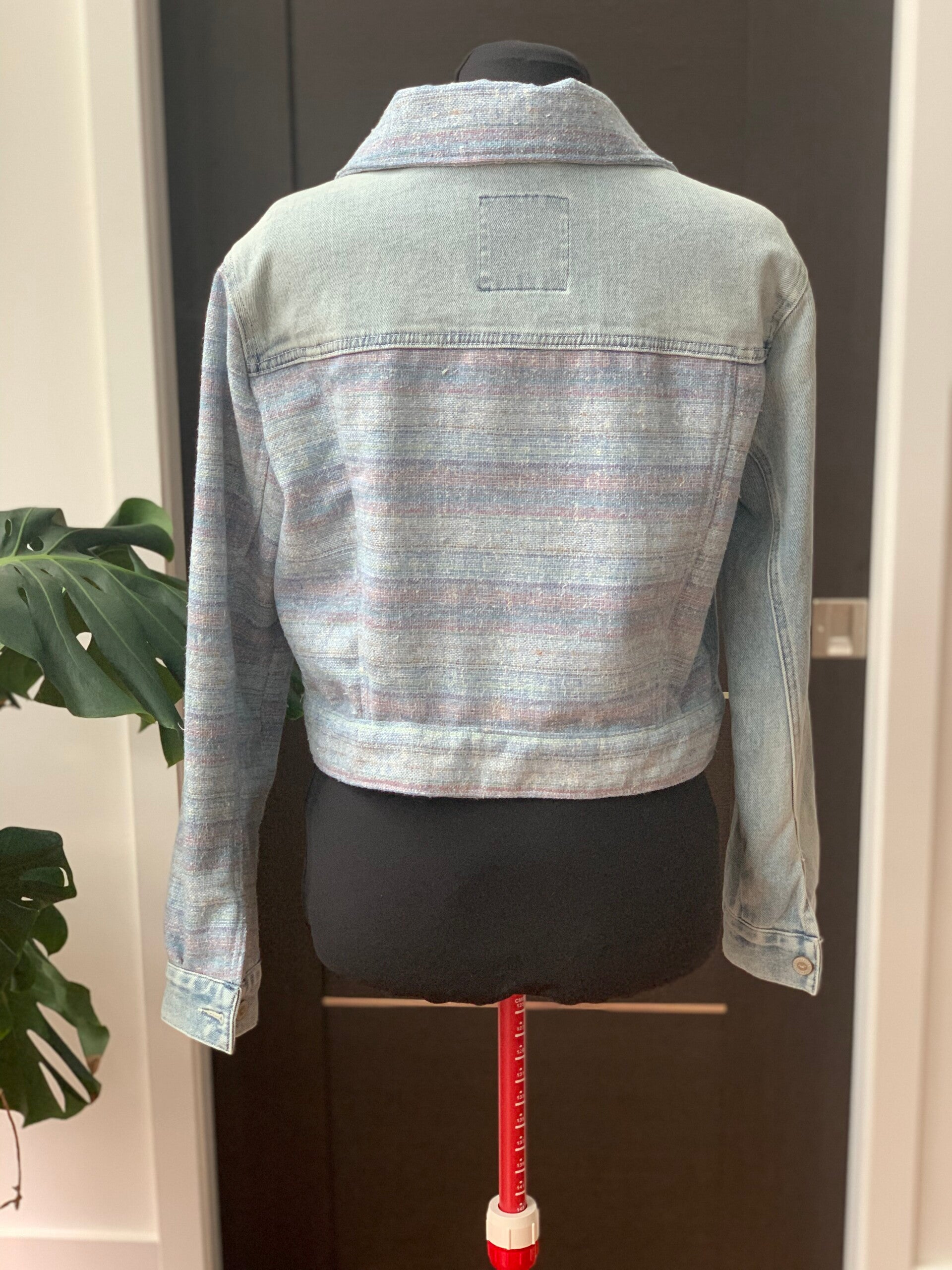 Eye-catching Asymmetrical Light Blue Denim and Pastel Tweed Jacket